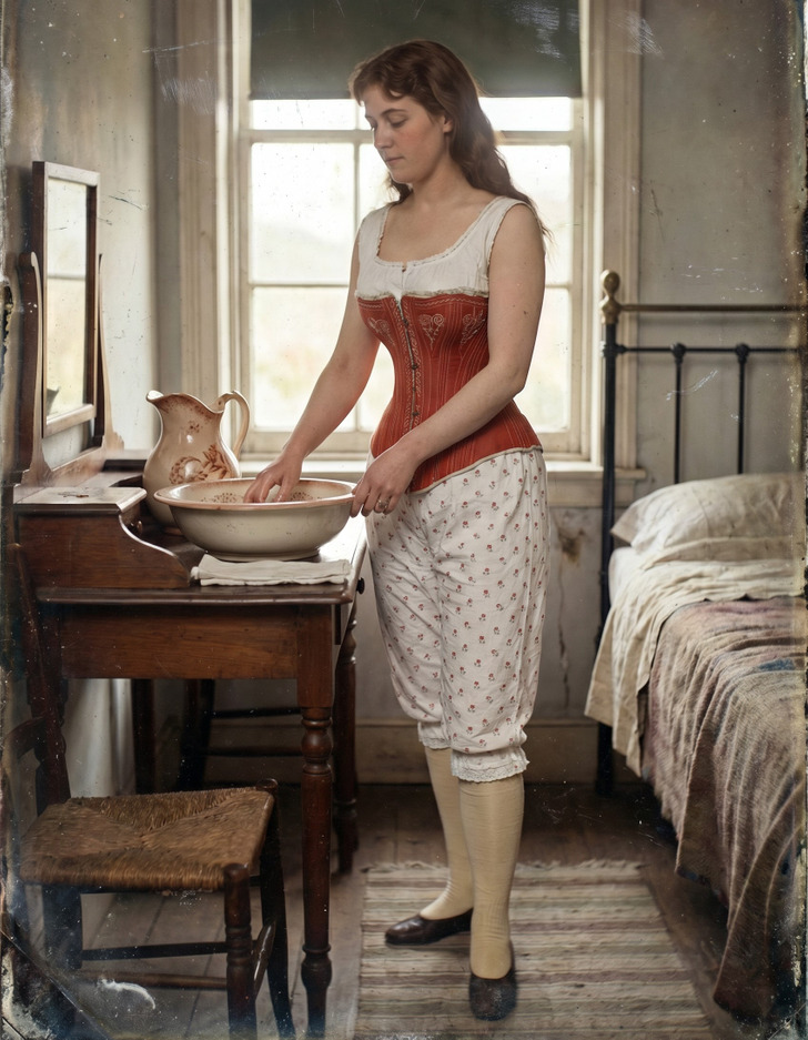 Несмотря на то, что горничные целыми днями сновали по дому, под платье им приходилось надевать корсет. К счастью, во второй половине XIX века появились модели, с шнуровкой которых девушка могла справиться и без посторонней помощи. Причём если раньше эту деталь туалета делали исключительно бежевого или белого цвета, то к концу века в моду вошли яркие разноцветные корсеты.