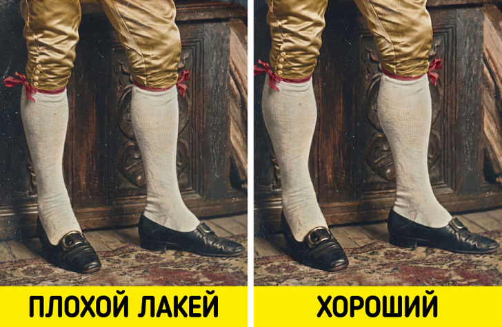 Кроме роста, господа обращали внимание на объём икр слуги. Чем мускулистее они были, тем лучше. Благо, что ливрея лакеев (бриджи и чулки) помогала быстро оценить этот параметр. Поэтому некоторые молодые люди носили специальные накладки. Наверное, больше всего лакеи тревожились, чтобы эти подложные икры ненароком не сползли вместе с чулками и не выпали.