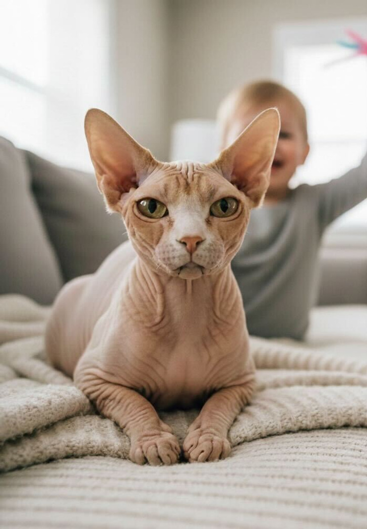 Сфинксы — это кошки среднего размера, которые устанавливают очень тесную связь со своими семьями. Это настоящие «профессионалы по обнимашкам» (cuddle commandos), которые всегда на посту и не прочь погоняться по дому за маленькими искателями приключений. Сфинксы известны своим игривым и энергичным характером. Их ласковый нрав делает их отличными компаньонами для детишек.