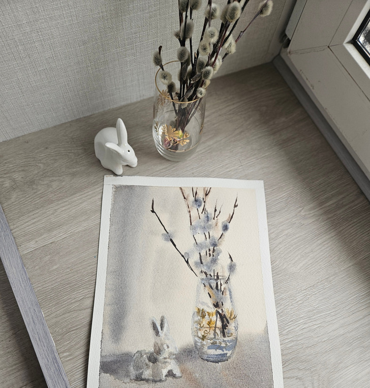 Девушка решила передать другим свое апрельское настроение и нарисовала картину с веточками вербы и пасхальным зайцем. Пользователи высоко оценили ее работу и поблагодарили за этот пост.