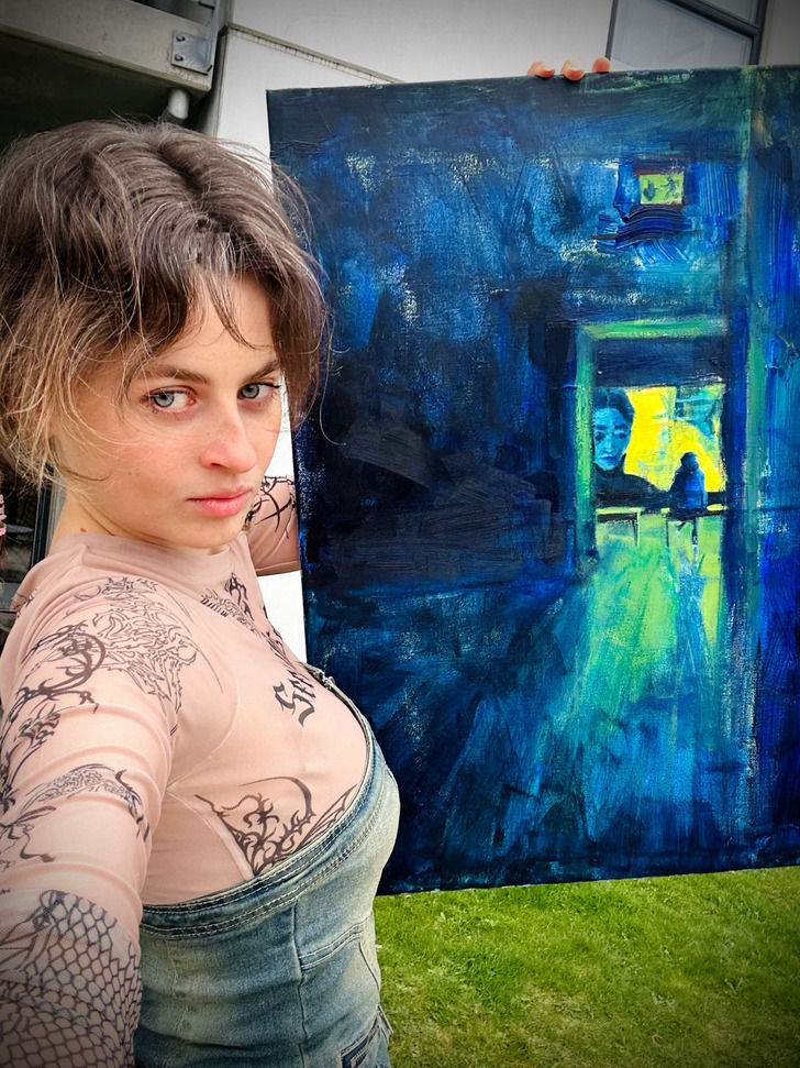 Девушка показала свою картину под названием «Кино», над которой она начала работать во время апрельского снегопада. Она рассказала: «Рисовала три дня. Попутно „украсила“ брызгами интерьер».