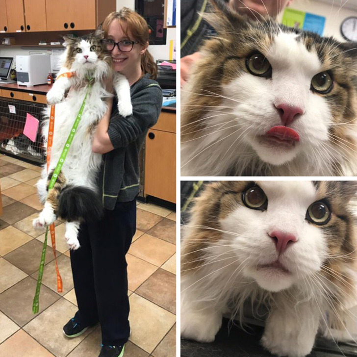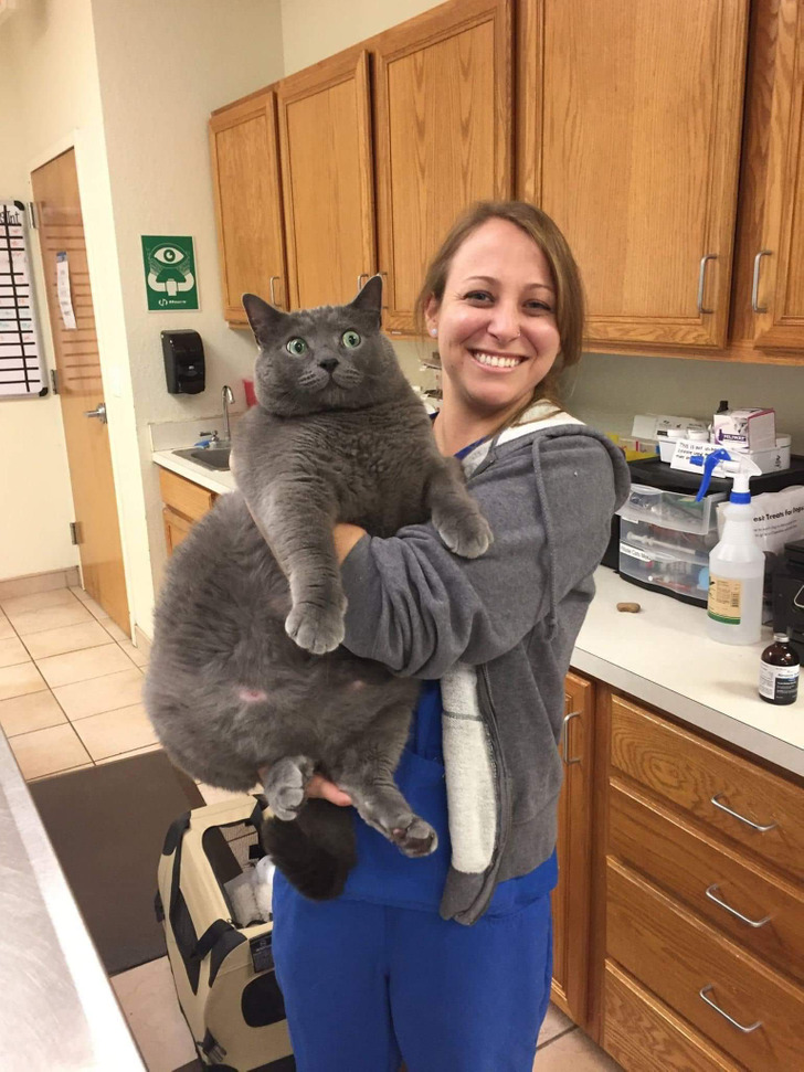 «Полюбуйтесь на этого здоровяка, которого привели ко мне в ветеринарную клинику. Он весит 12 кг, а я ростом всего 155 см»