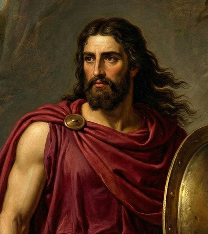 Предположительно, царь Леонид не остригал свои длинные кудри, а под плащом носил алый хитон.