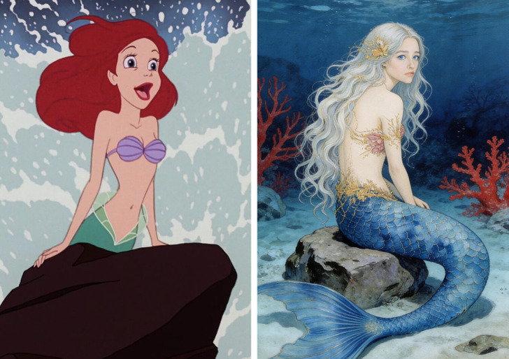 Диснеевская Русалочка, обладательница неуемного нрава и копны ярко-красных волос совсем непохожа на тихую и задумчивую 15-летнюю Русалочку Андерсена. Сказочник описывал ее как «странное дитя» и «прехорошенькую» девушку, с кожей нежной и прозрачной, как лепесток розы, и глазами синими, как глубокое море. А атмосфера сказки намного печальнее и загадочнее, чем изображено в мультфильме.