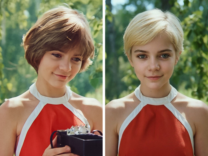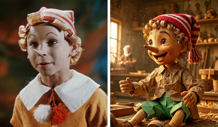 Конечно, в 1975-м году, когда на экраны вышел фильм «Приключения Буратино» никакой компьютерной анимации не существовало, и Буратино сыграл талантливый юный актер Дмитрий Иосифов. Но теперь мы с помощью ИИ можем точно воспроизвести облик Буратино — деревянного мальчика, вырезанного из говорящего полена. У Буратино в книжке была курточка, склеенная из коричневой бумаги и ярко-зеленые бумажные штанишки, а также колпачок с кисточкой, сшитый из старого носка.