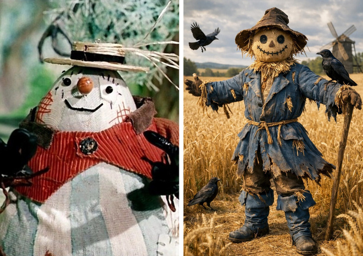 Забавное чучело из старого мультика не похоже на описание в книге Волкова «Волшебник Изумрудного города». Там внешность у Страшилы другая: голова сделана из мешочка, набитого соломой, с нарисованными на нем глазами и ртом, а наряд состоит из поношенного и дырявого голубого кафтана, старой потертой шляпы и голубых ботфортов, какие обычно носят жевуны, обитатели его страны.