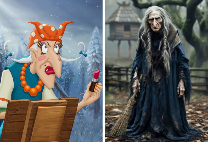 Баба-Яга в мультфильмах и книгах образ часто яркий, комический и даже кокетливый, но в сказках ее образ гораздо мрачнее: это горбатая старуха с длинным крючковатым носом («нос в потолок врос») и костяной ногой: не человек, а магическая сила.