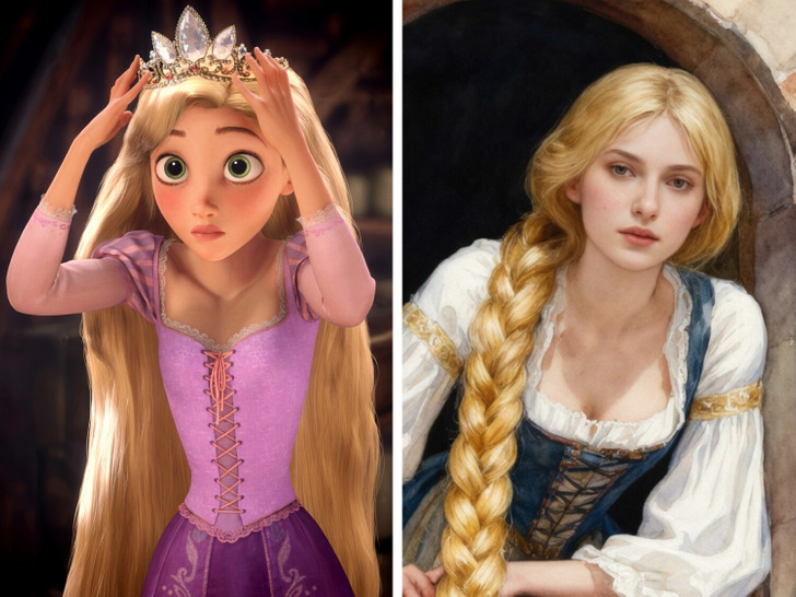 Рапунцель в классической сказке братьев Гримм не была принцессой. Ее родителям, обычным людям, пришлось отдать ее колдунье — мадам Готель, за то, что они сорвали в ее саду рапунцель — съедобное растение. В 12 лет, когда девочка стала ослепительной красавицей, колдунья заперла ее в башне без дверей далеко в лесу. Поэтому Рапунцель вряд ли выглядела так, как в диснеевском мультике — на ней, скорее всего, было скромное практичное платье в стиле ампир, подобное которому носили простолюдинки в 1812-м году, времени публикации сказки. К тому же прическа у нее была другой. Когда колдунья хотела подняться в башню, она звала: «Рапунцель, Рапунцель, проснись! Спусти свои косоньки вниз».