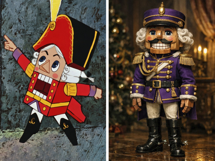 Волшебный мультфильм про Щелкунчика 1973 года мы помним с детства. Но если сравнить образ главного героя с его описанием в сказке «Щелкунчик и Мышиный король» немецкого писателя Эрнста Теодора Амадея Гофмана, то мы увидим отличия. Когда Мари нашла Щелкунчика под елкой, она увидела странного нескладного человечка, сделанного из дерева. На нем был фиолетовый мундир, «весь в пуговичках, опушках и позументах», узкие рейтузы и сапоги со шпорами. Из-под плоской шапочки были видны белые букли нитяного парика, а сам Щелкун был обладателем щеголеватых усов!