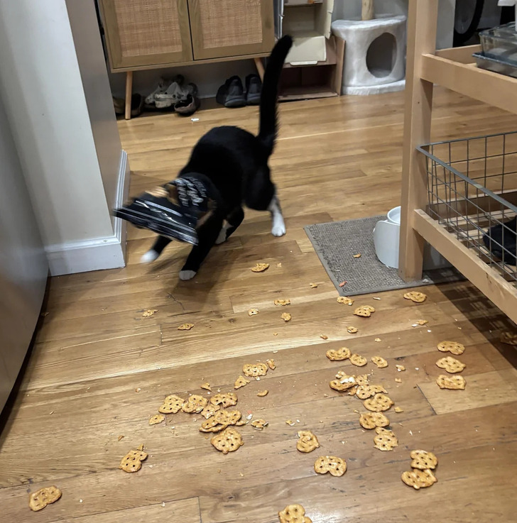 «Опять поймала ее с украденным тампоном. А буквально через минуту она уже залезла в холодильник. Эта кошка — просто маленькое пушистое стихийное бедствие!»