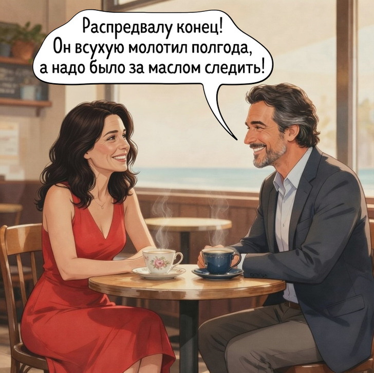 Потянулись месяцы странных свиданий. Однажды мужчина заказал чашку чая, а я — кофе и десерт. Подношу ложку ко рту, а он вдруг наклоняется ко мне, открывает рот и ждет. Я в шоке спрашиваю: «Что?» А он выдает: «И мне кусочек!» Мужик, да я тебя впервые вижу!