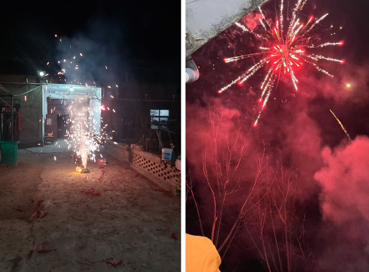 В определенный момент нас позвали к столу. Всем места не хватило, садились по очереди. На каждого — по миске с пельменями. Было около 7 часов вечера. Мне вообще казалось, что это так, заморить червячка перед основными гуляниями. Но нет, поели и хватит. А потом несколько часов постоянных фейерверков. Считается, что громкие звуки пугают злых духов, поэтому многочисленные салюты — обязательный элемент праздника. В каждом дворе доставали целые ящики пиротехники и устраивали настоящие шоу.