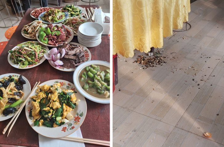 В гостях на столах уже не только пельмени, но и куча других традиционных китайских блюд. А на входе в ладошку обязательно насыпят семечек, чтобы было чем перекусить, пока хозяева накрывают на столы. Отказаться от такого угощения нельзя, это будет проявлением неуважения. И я заранее спросила у сестры, что же мне делать, ведь семечки я совсем не ем. В итоге я минут 20 сидела с ними в руке, а потом потихоньку ссыпала на стол.