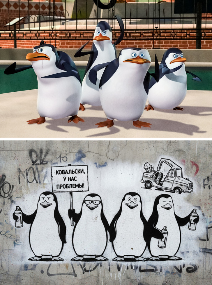 Как-то так могли бы выглядеть пингвины из Мадагаскара в стиле знаменитого уличного художника Бэнкси