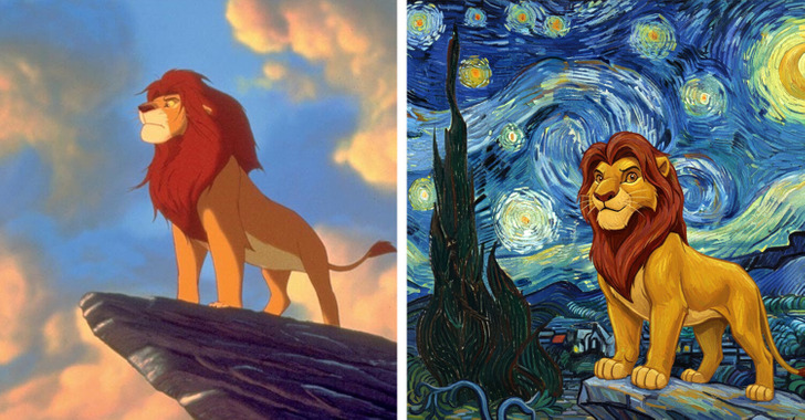 Симба из мультика «Король Лев» внутри «Звездной ночи» Ван Гога