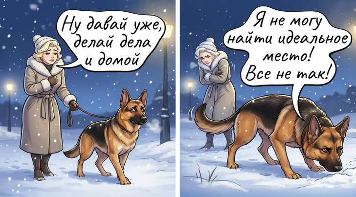 2. Мы думаем, что вышли на пять минут на мороз, чтобы он сделал свои дела, а наш пес, оказывается, целый час должен сосредотачиваться