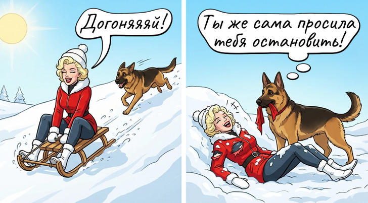 5. Мы думаем, что просто делаем красивого «снежного ангела», а наш пес, скорее всего, думает: «Тревога! Человек тонет! Я вытащу тебя из этой ловушки, даже если мне придется отгрызть тебе рукав!»
