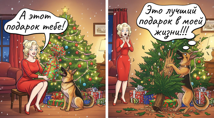 3. Мы думаем, что наряжаем рождественскую елку, чтобы создать праздничную атмосферу, а наш пес, скорее всего, думает: «О, чудо! Моя хозяйка подарила мне огромную хвойную игрушку, прямо как я люблю, да еще и с кучей шариков!»