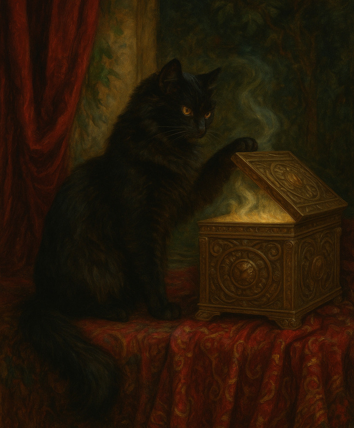 Пандора кисти Уотерхауса отвлеклась лишь на секундочку, а вездесущая кошка уже раз — и залезла лапкой в заветную шкатулку! Знакомая каждому кошатнику ситуация...