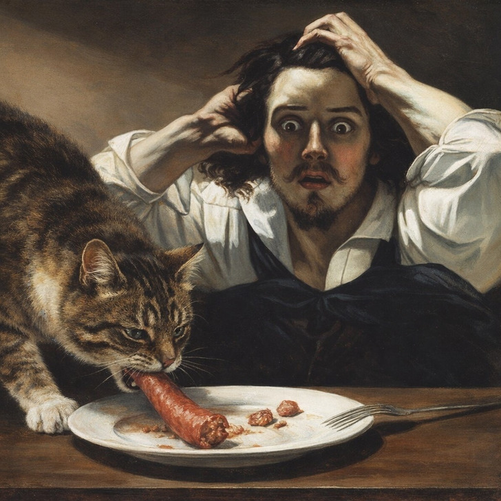 Отчаяние молодого человека на картине вполне оправдано, но у кота на колбасу были свои виды