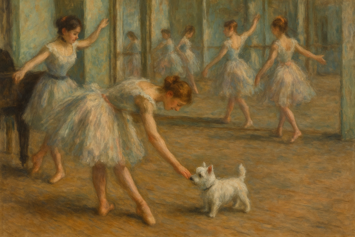 Интересно, успеют ли балерины Дега подготовиться к предстоящему выступлению, учитывая, что их студию посетил такой очаровательный гость?
