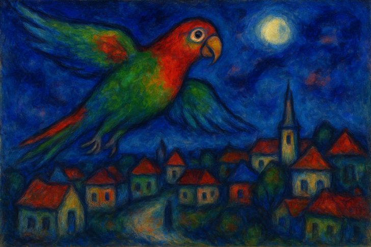 В отличие от известной пары с картины Шагала, у попугая для полета есть крылья, но, уверены, ему не менее чудесно порхать над городом, отбросив все земное