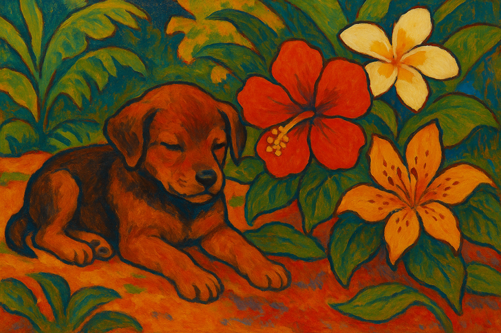 Наигравшись на свежем воздухе Таити, щеночек прилег отдохнуть среди ярких цветов кисти Гогена и, неожиданно, идеально вписался