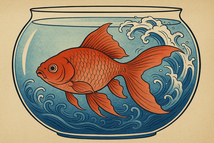 Сомневаемся, что простой аквариум сдержит мощь волн Хокусая, но полагаем, что именно золотую рыбку он поместил туда неспроста...