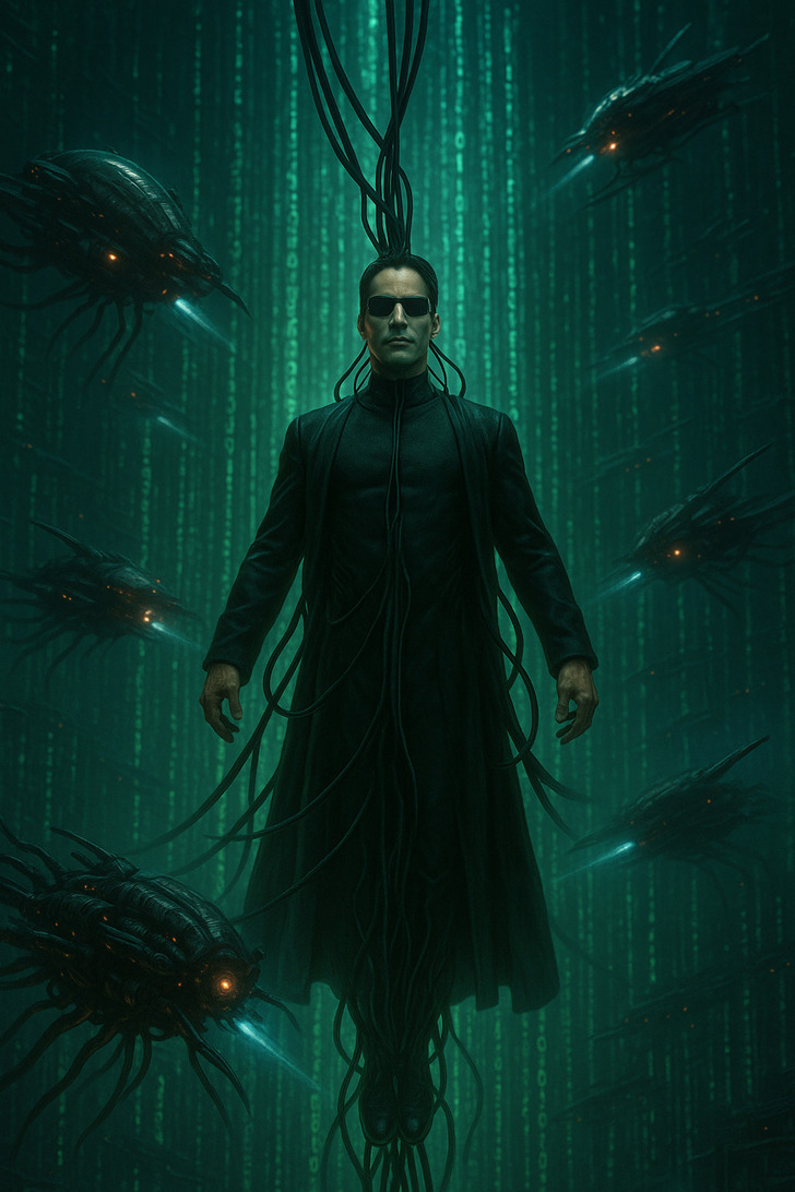 А вот Нео в фантастическом фильме ужасов поглотил Матрицу. Или она его. Злодей из него вышел бы восхитительный