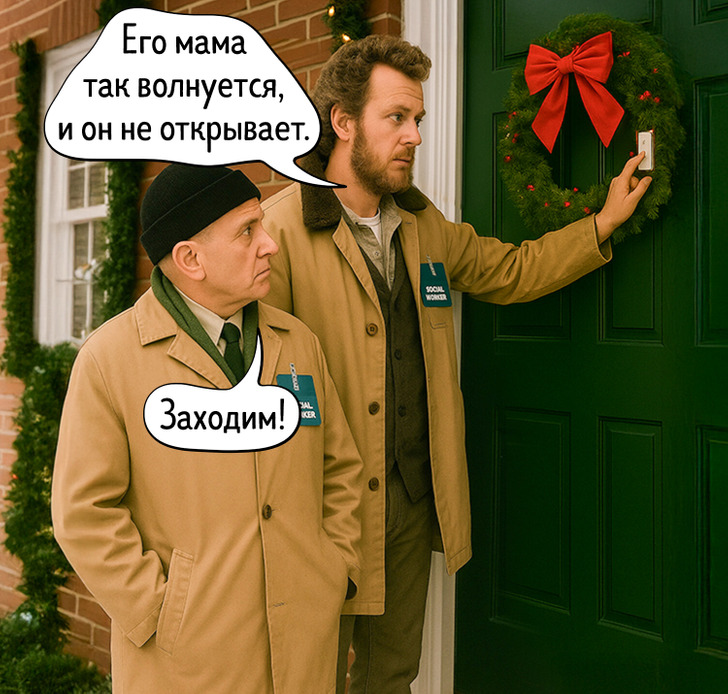 В «Один дома» Марв и Гарри были бандитами, в нашей фантазии они — социальные работники, которым мама Кевина все-таки дозвонилась в Новый Год