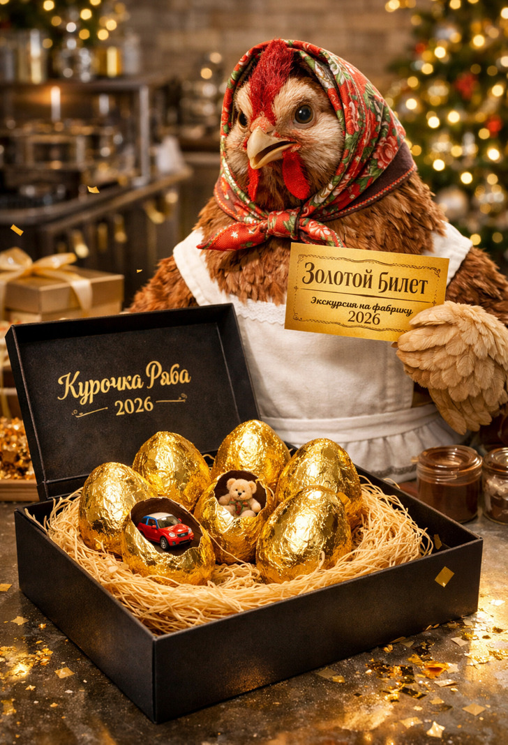 Курочка Ряба основала собственную кондитерскую фабрику. Теперь она производит не простые, а роскошные шоколадные яйца в съедобной золотой фольге. К Новому году она выпустила лимитированные подарочные наборы: шесть яиц в гнезде из теста катаифи. Внутри каждого яйца — подарок-сюрприз, а в нескольких — уникальные золотые приглашения на экскурсию по фабрике. Покупатели в восторге!
