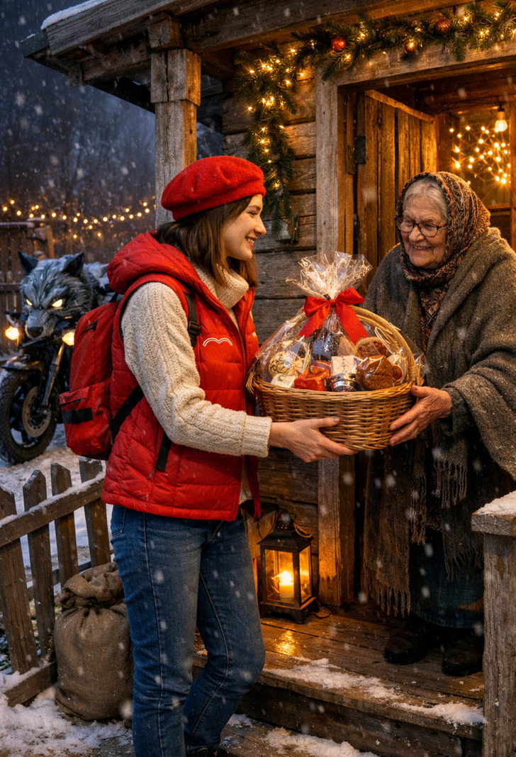 Повзрослев, Красная Шапочка направила свою энергию в благотворительность. В канун Нового года она организует волонтерское движение «Корзина для бабушки». А разносят подарки с волшебным ароматом праздника волонтеры в красных беретах!