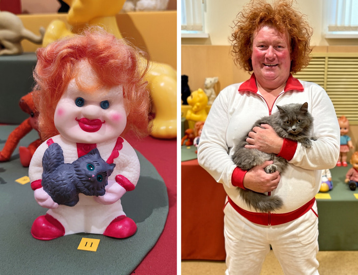 Тут тоже образ сразу считывается. Эта игрушка точно была бы мужчиной средних лет с непокорной рыжей шевелюрой и с котиком на руках.
