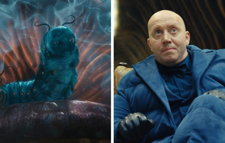 Синяя гусеница, или Абсолем, у Бертона — мудрое и всеми уважаемое существо, которое хоть и говорит загадками, но тем не менее дает советы Алисе. Гусеница Бурунова — просто гусеница, и роль у нее скорее комическая.