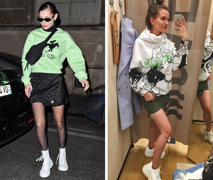 «Я вообще не любитель спортивного стиля, но всегда было интересно попробовать что-то необычное, трендовое. Образ Беллы Хадид стал идеальным подспорьем в эксперименте. Мини-юбка, толстовка и кроссовки — сочетание, в сторону которого я бы даже и не посмотрела в обычной жизни. Но мне понравилось, как на контрасте выглядит объемный верх с открытыми ногами», — говорит об эксперименте Дарья.
