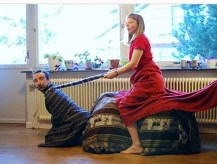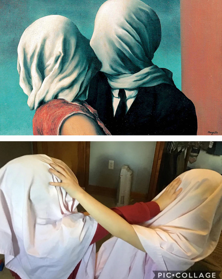 «Мои дети воссоздали для конкурса знаменитую картину Рене Магритта „Влюбленные“. Конечно, они добавили немного от себя»