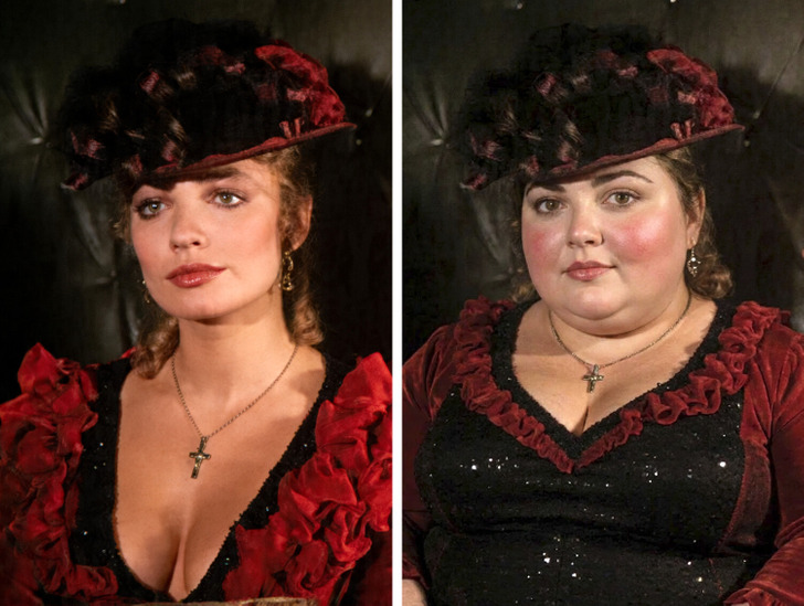 Ну, ИИ перестарался, я считаю. Между левой и правой картинкой еще уйма кг. Я согласна, что реальная актриса ни разу не пышка, но и картинка ИИ на привлекательную пышечку не тянет.