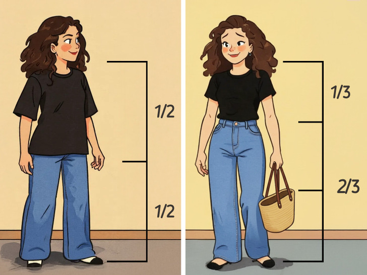 Как правило, тип джинсов выбирают по фигуре, но с их помощью также можно скорректировать рост и визуально изменить пропорции. Если вы хотите казаться выше, выбирайте длинные джинсы с высокой посадкой — так нижняя часть тела будет занимать больше визуального пространства.