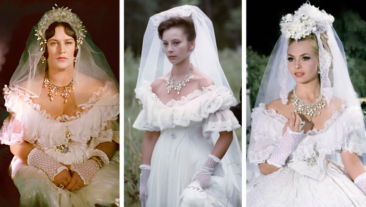6. Какая героиня выходила замуж в этом платье — купчиха Белотелова в исполнении Нонны Мордюковой, Ольга Скворцова, которую сыграла Галина Беляева, или легендарная Анжелика Мишель Мерсье?