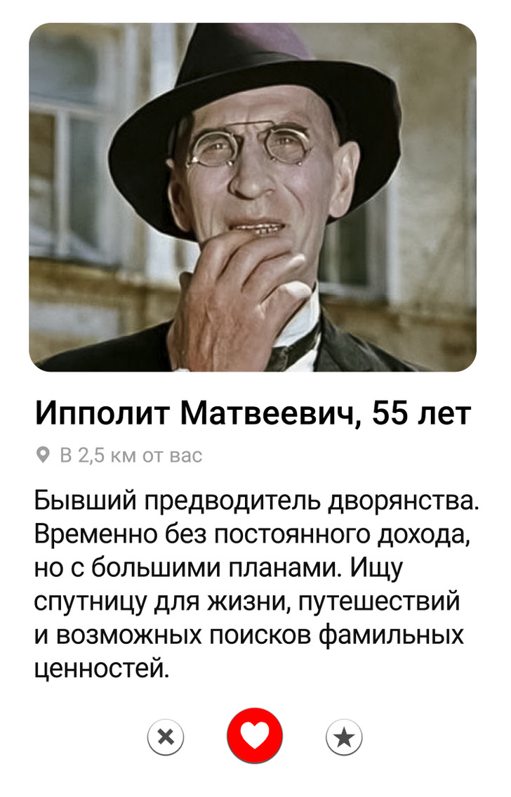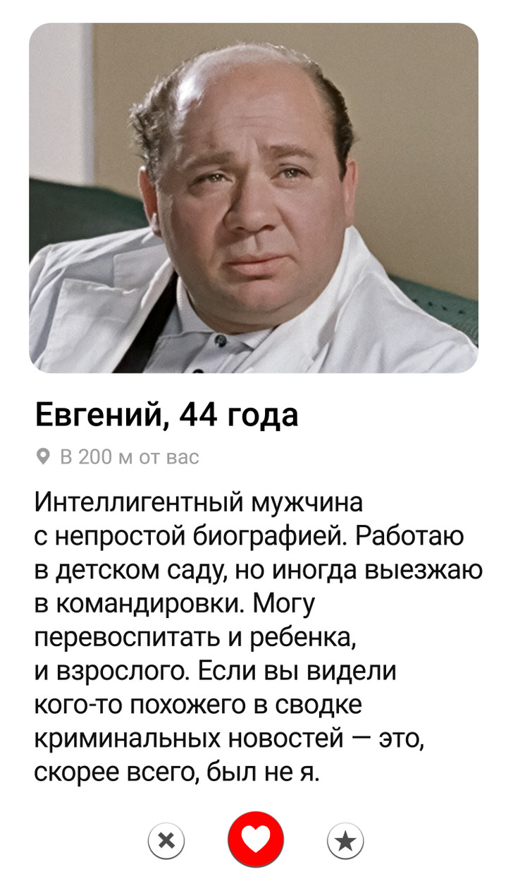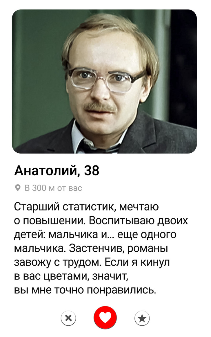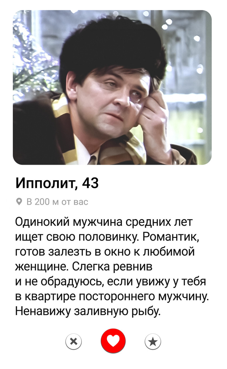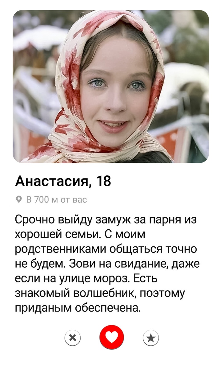 Только вообразите, что герои фильмов нашего детства и юности обзавелись современными технологиями и решили найти свою вторую половину в сети. Мы представили, как могли бы заполнить свой профиль на сайте знакомств Шурик из «Операции „Ы“», Настенька из «Морозко», Новосельцев из «Служебного романа» и другие наши любимые персонажи.