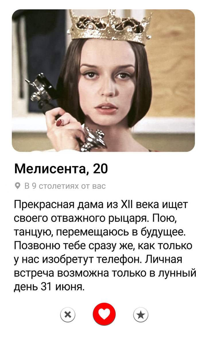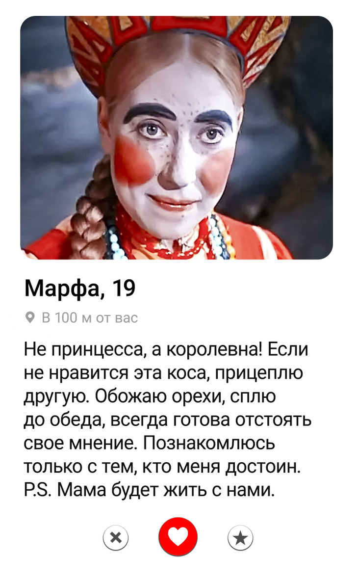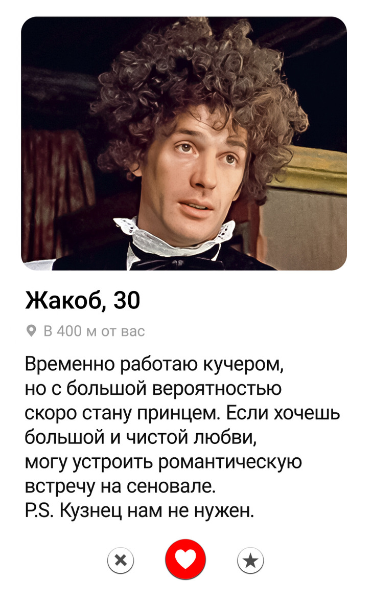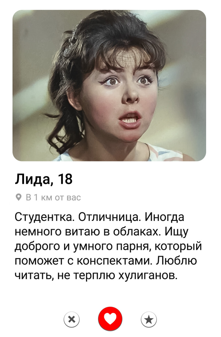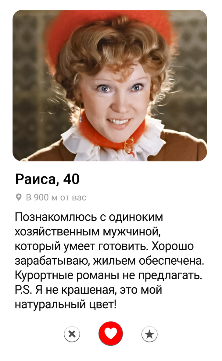 Только вообразите, что герои фильмов нашего детства и юности обзавелись современными технологиями и решили найти свою вторую половину в сети. Мы представили, как могли бы заполнить свой профиль на сайте знакомств Шурик из «Операции „Ы“», Настенька из «Морозко», Новосельцев из «Служебного романа» и другие наши любимые персонажи.