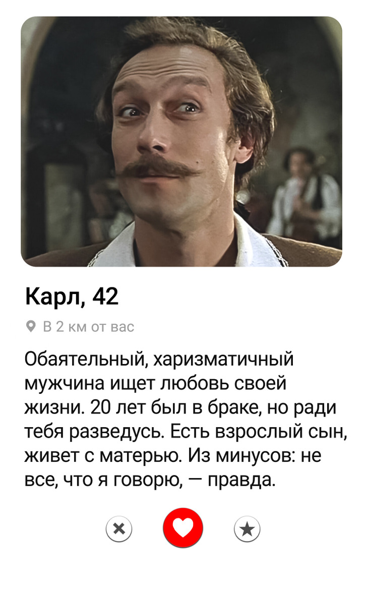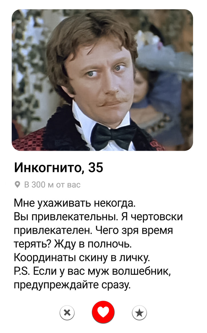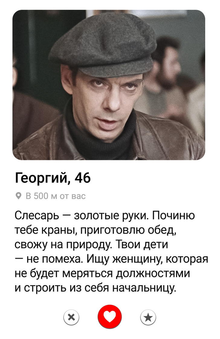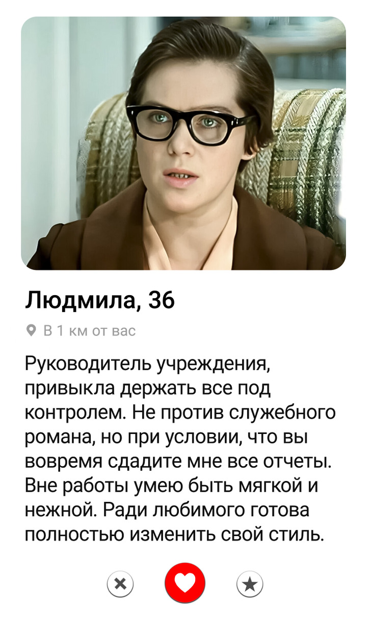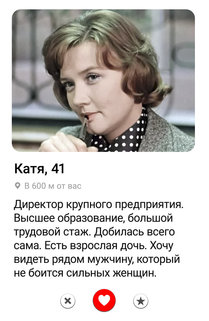 Только вообразите, что герои фильмов нашего детства и юности обзавелись современными технологиями и решили найти свою вторую половину в сети. Мы представили, как могли бы заполнить свой профиль на сайте знакомств Шурик из «Операции „Ы“», Настенька из «Морозко», Новосельцев из «Служебного романа» и другие наши любимые персонажи.