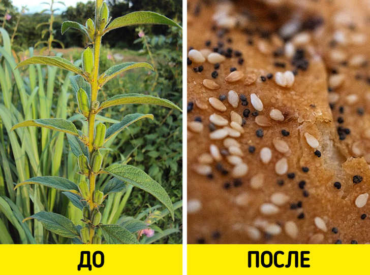 Булочка с кунжутом для нас уже вещь обыденная. Некоторые добавляют эти семена в салаты и соусы. А вот знали ли вы, как он растет? Чем-то напоминает созревший люпин, да? Эти стручки высушивают, а потом извлекают из них семечки. В зависимости от сорта он может быть черным, белым, красным.